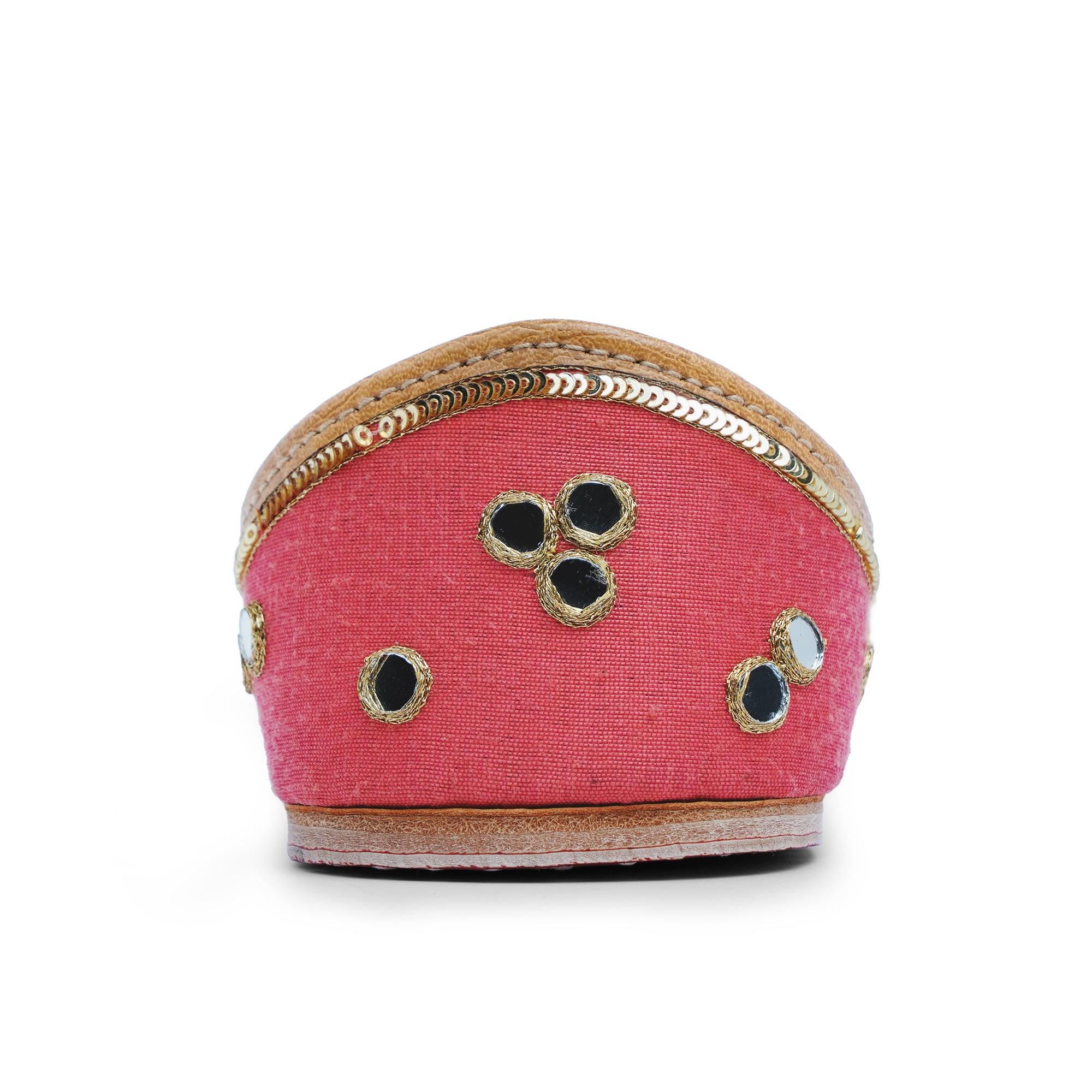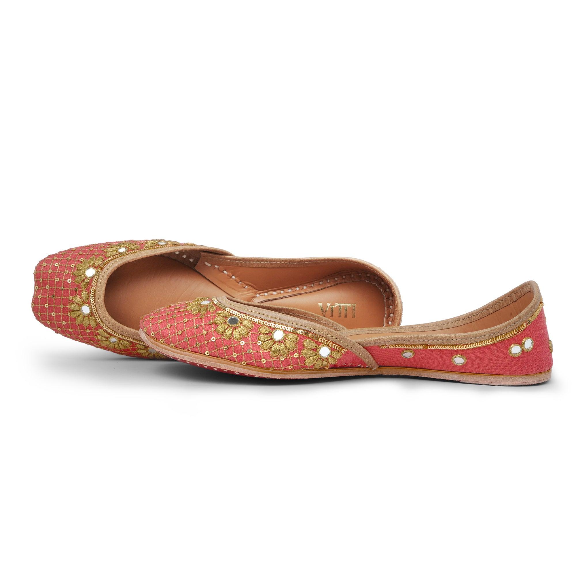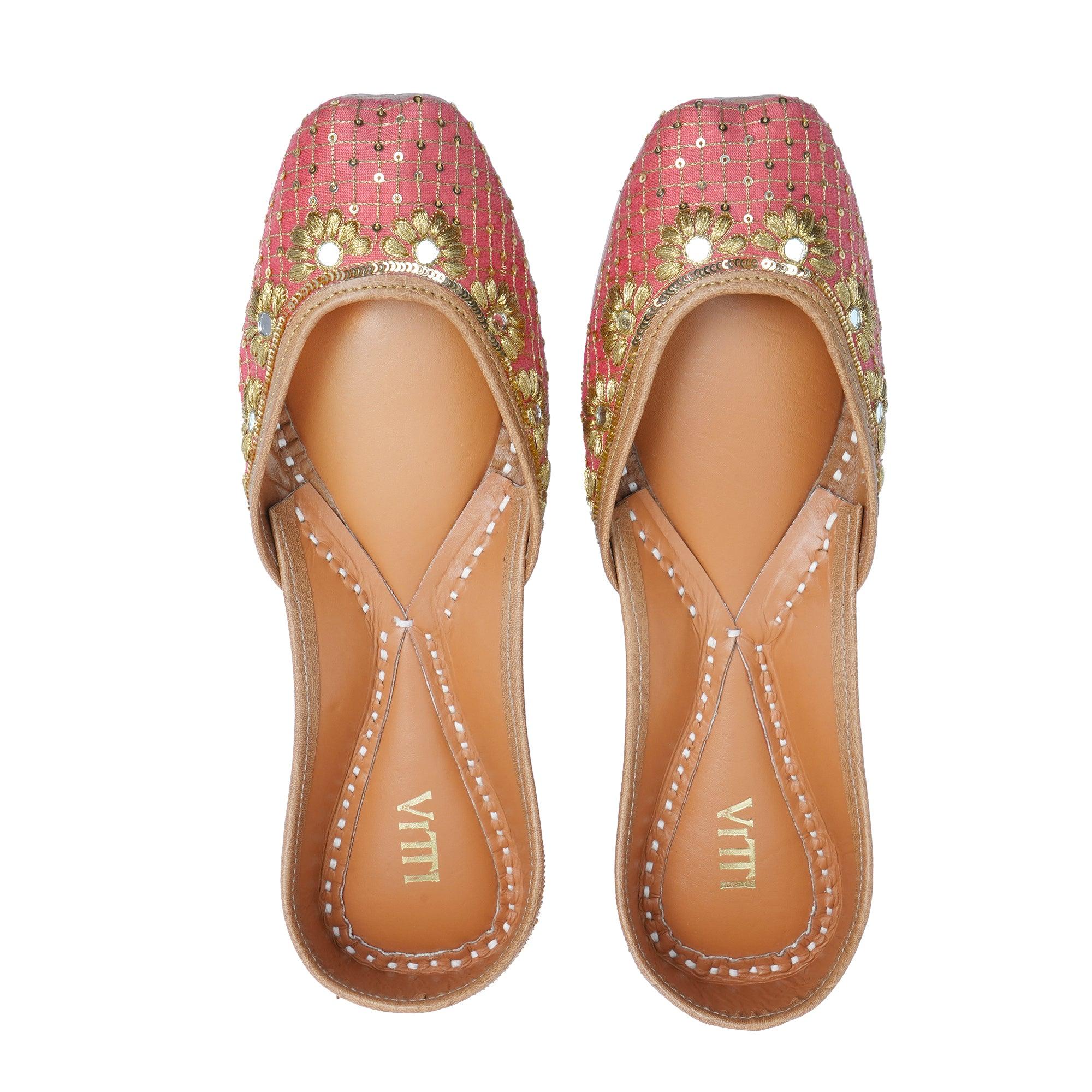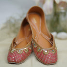 Embrace your femininity with our stunning jutti, featuring intricate embroidery of golden Zari flowers and a delicate Zari thread jaal on a blush pink base. The back is adorned with beautiful mirrors outlined with Zari, adding an elegant touch. This jutti in a timeless blush pink hue is a versatile addition to your wardrobe, perfect for adding a touch of glamour to any outfit.
