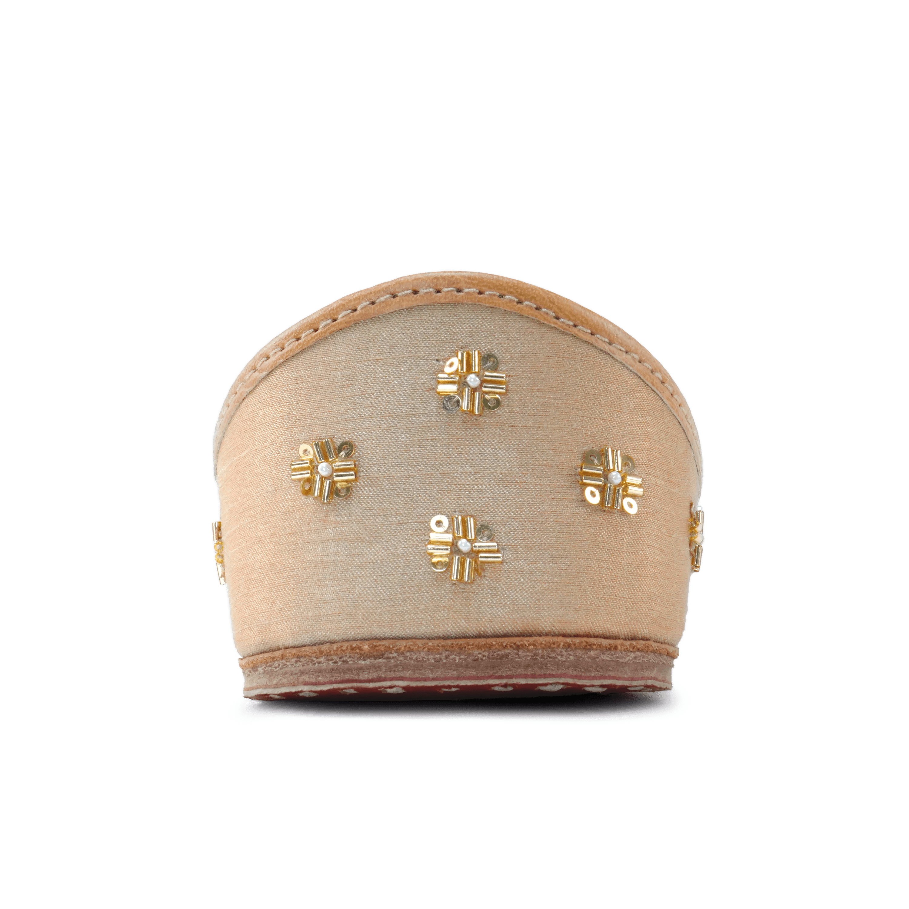 Beige base adorned with a cluster of beautiful white pearls, along with golden nalki and sequins, that brings out the elegant charm in you! Wear it with your saris, dresses, or pants at formal meetings, brunches, or parties, and you'll be a winner!