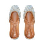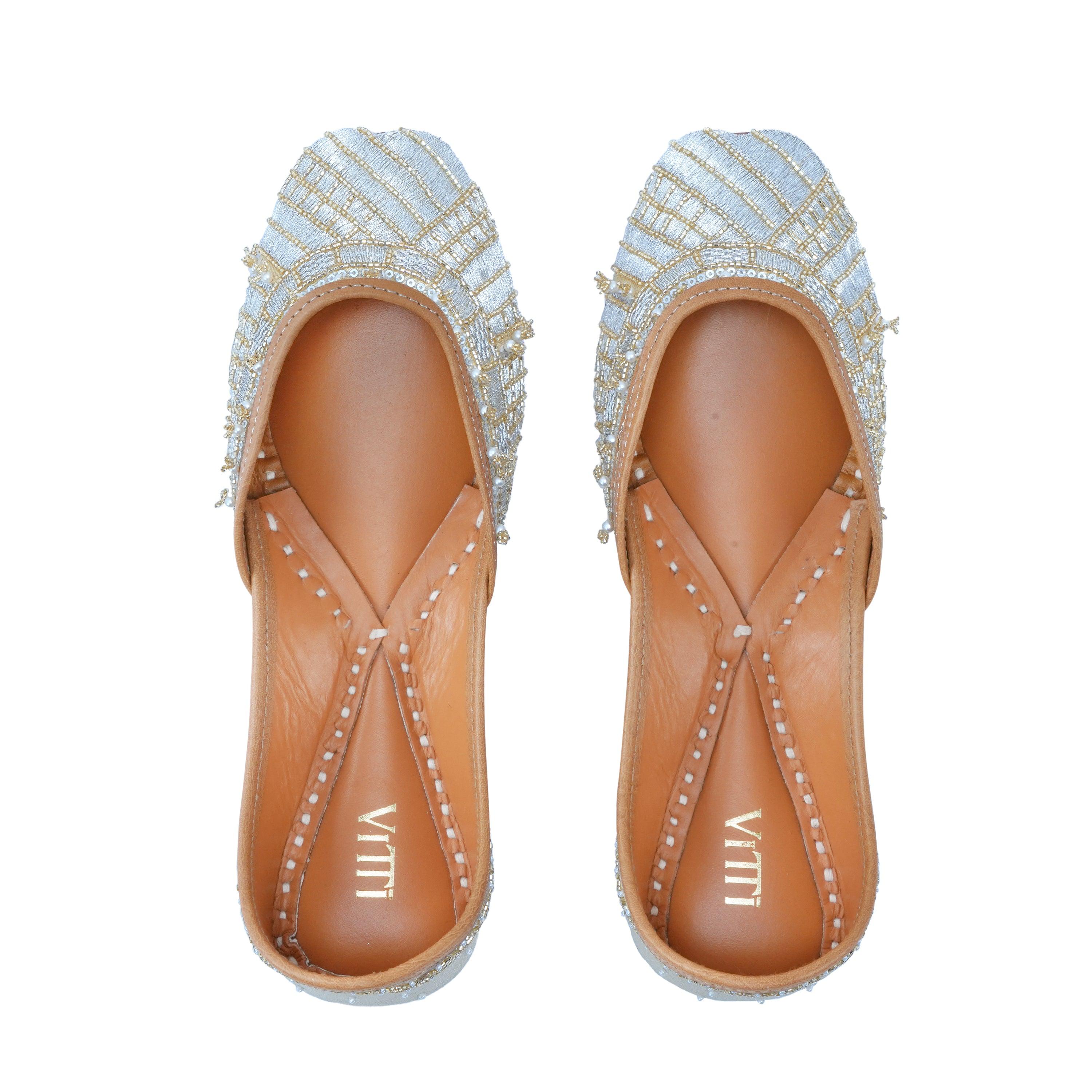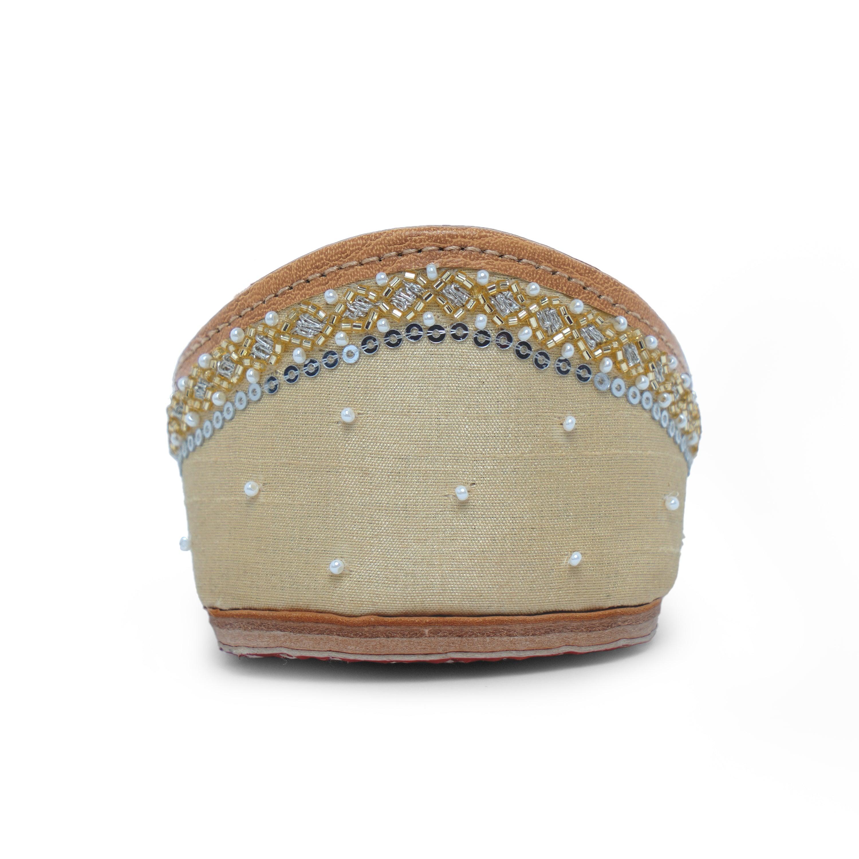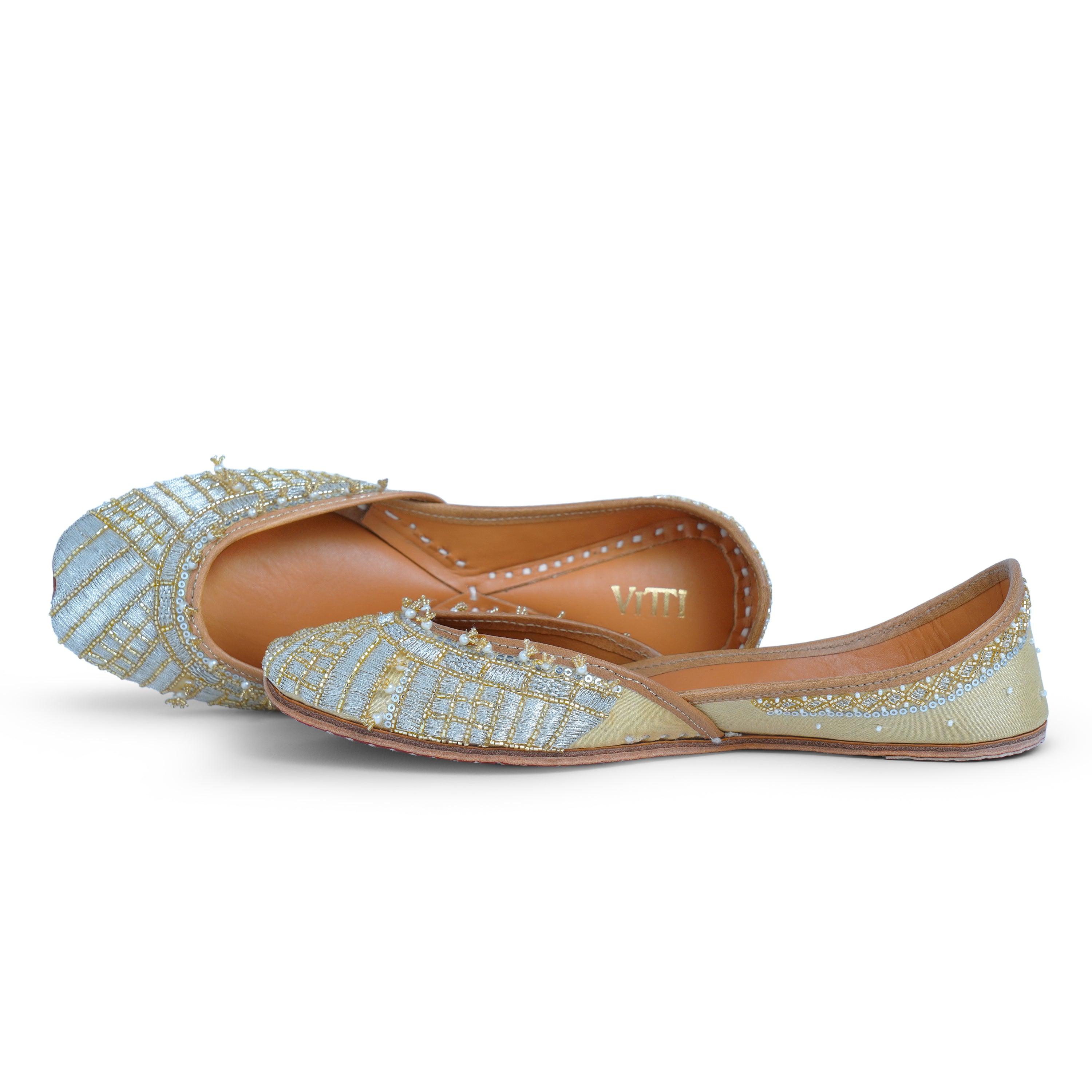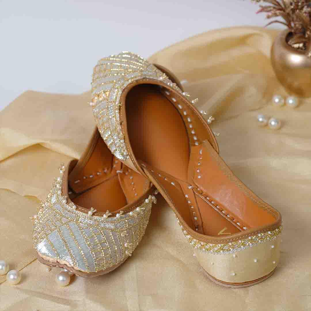There's no such thing as too much Zari, right? This jutti is heavily embellished with edgy silver sequins, beads, and Zari work, amped up with beautiful off-white pearls, golden beads, and gold cutdana. This fun, multimedia design is loaded with Zari work, making it the perfect gold jutti you've been searching for! Take a closer look, and we assure you that you won't be able to look away!