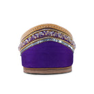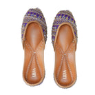 Experience the unmatched beauty of our sparkling pair! Adorned with golden beads, sequins, transparent and silver crystals, and silver sequins and zari work, this jutti exudes a lustrous shine. Its purple base is intricately embroidered with transparent pink crystals outlined with gold cutdana, featuring jaal work with gold dori and silver sequins with zari knots. Shiny crystals placed on gold and silver sequins add a dazzling touch.
