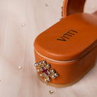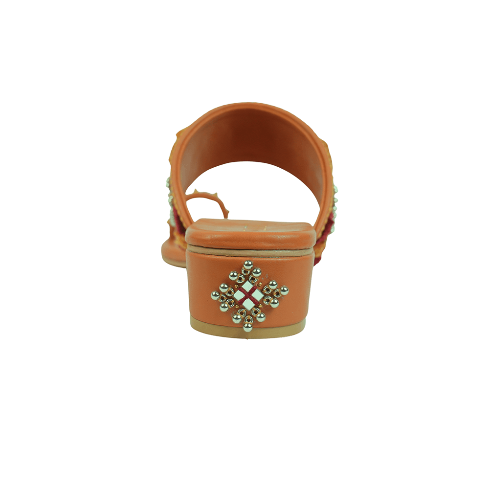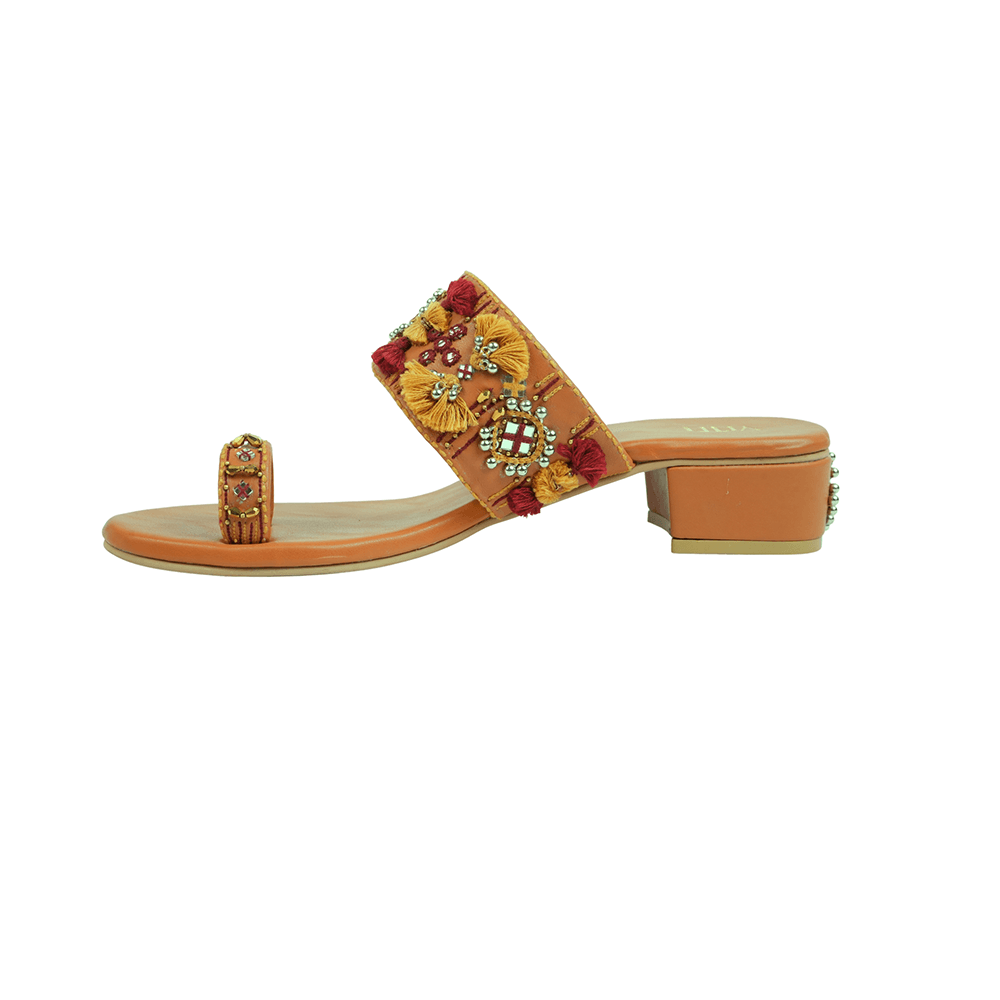 Celebrate the festive season with our Tawny Tassels Heels. The tan base is adorned with anchor threads in mustard and deep red, highlighted with silent ghungroos and tiny mirrors, inspired by traditional Kantha embroidery. These heels add a touch of cultural charm to your festive attire. Style them with ethnic or fusion outfits for a unique look.