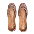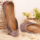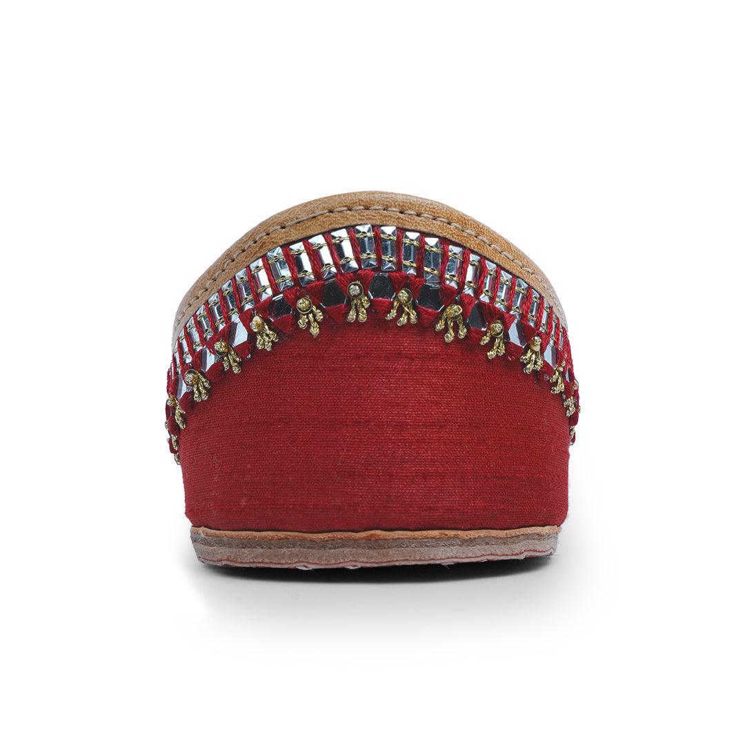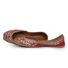 Experience the allure of understated night glam with our jutti, featuring a deep, warm color palette complemented by perfect gold accents. The maroon silk base is meticulously embroidered in a semi-circular pattern using gold cutdana, zari, sequins, mirrorwork, and silk threads. Inspired by festivities, this jutti represents a delightful fusion of traditional and contemporary aesthetics, offering a bold and fun statement for your ensemble.
