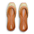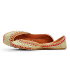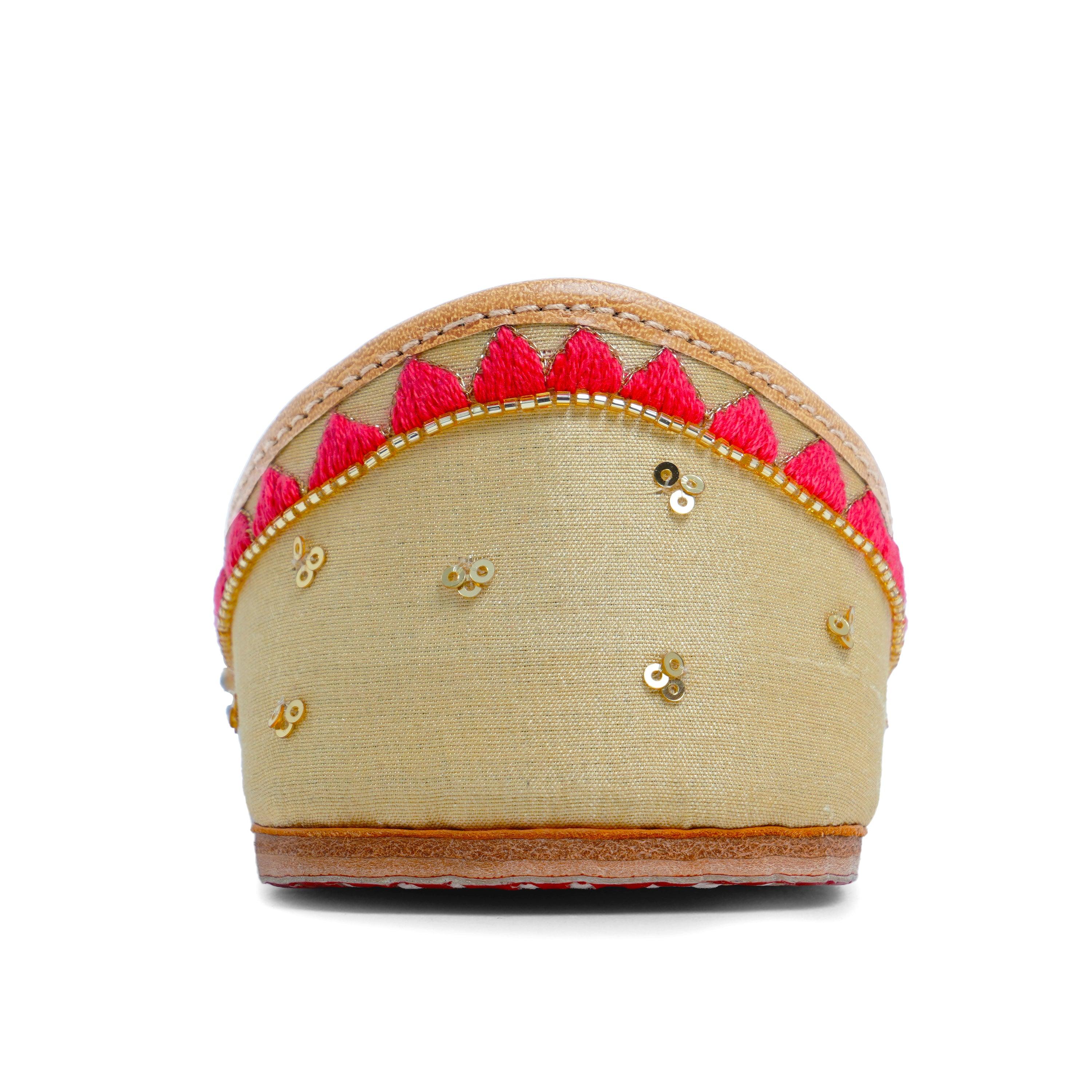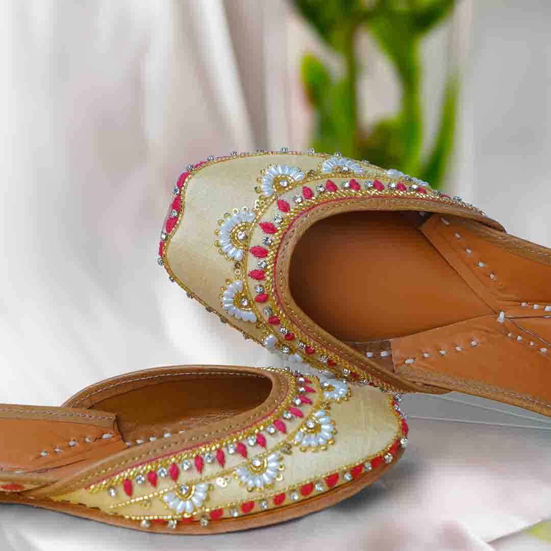 This design is as fresh as the first morning ray of the sun. Seher is a traditional jutti designed with a light mimosa-colored silk base, embroidered with pink anchor, golden sequins, beads, and clear crystals. Adding to its allure are the white bead flowers! Pair it with your everyday muted tones to dress up a look or with your fun festive outfit!