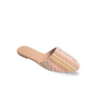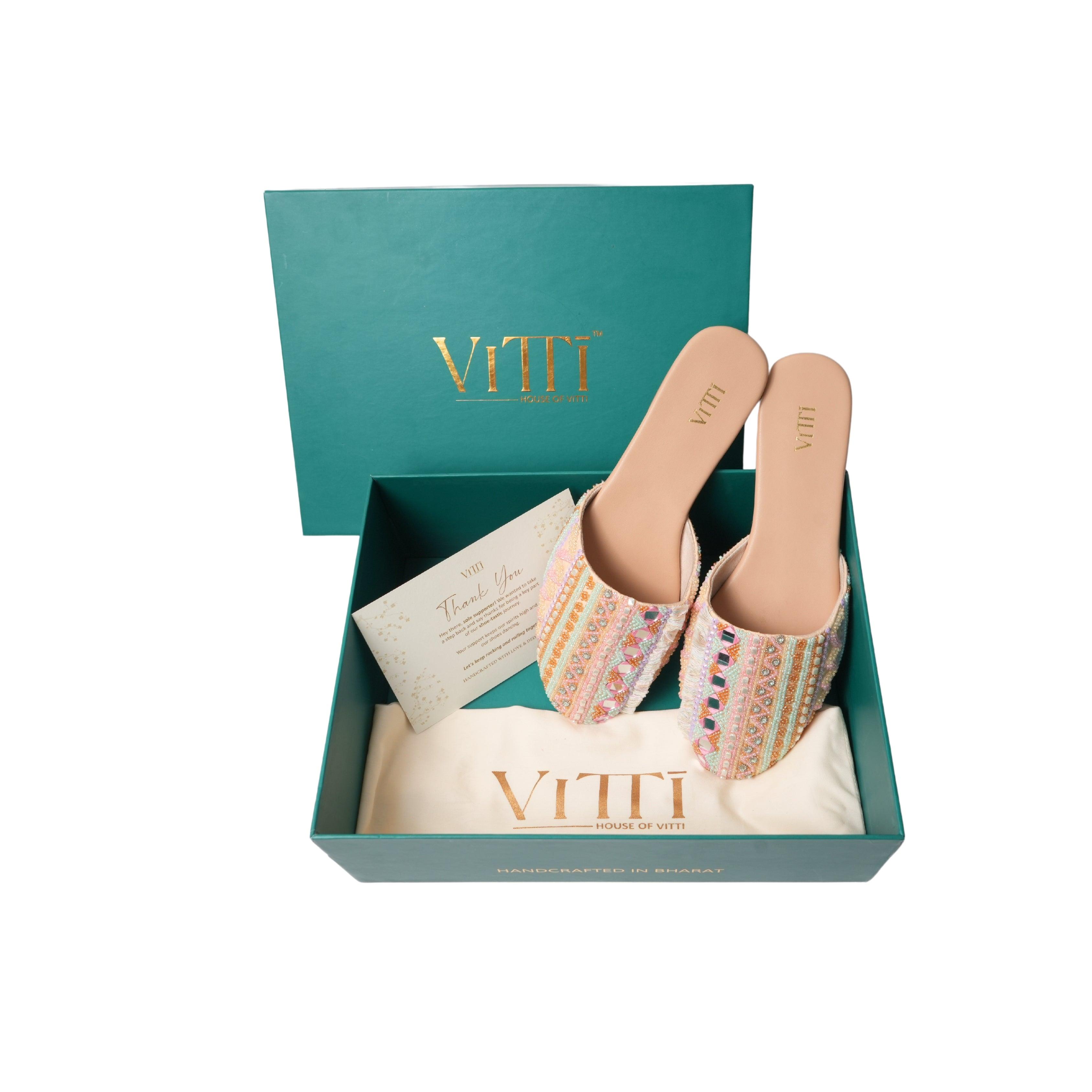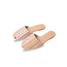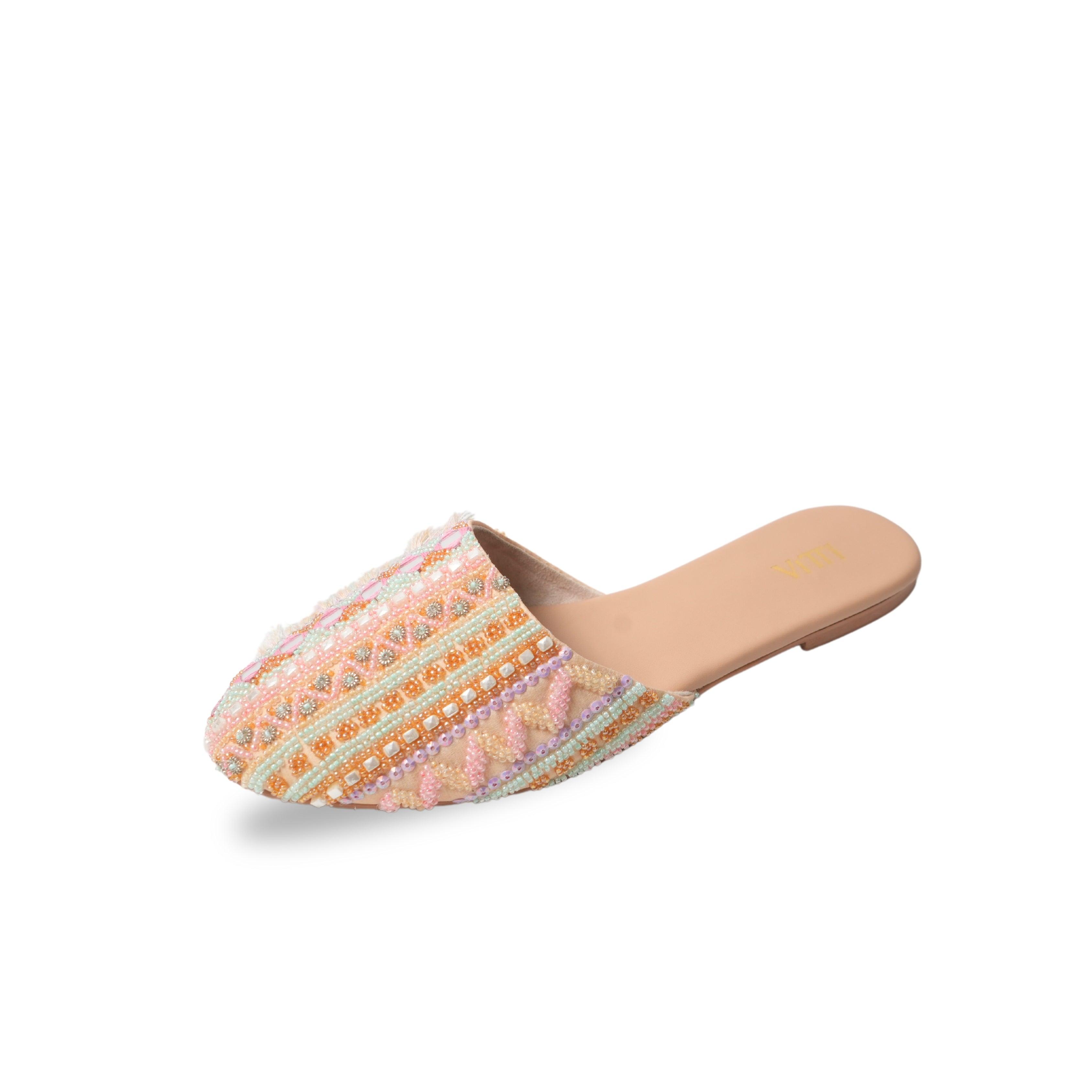 The delicate embroidery features lines of glass beads in soft pastel hues of pink, green, rust, and beige, adding a whimsical touch to the champagne base. Each line is meticulously crafted with unique embellishments, including metal rings, square ivory beads, rust-colored flowers, and square mirrors, creating a captivating tapestry of textures. The addition of pastel purple sequin tassels adds a playful element, making these mules the perfect accessory to elevate any outfit and make a statement wherever you go.