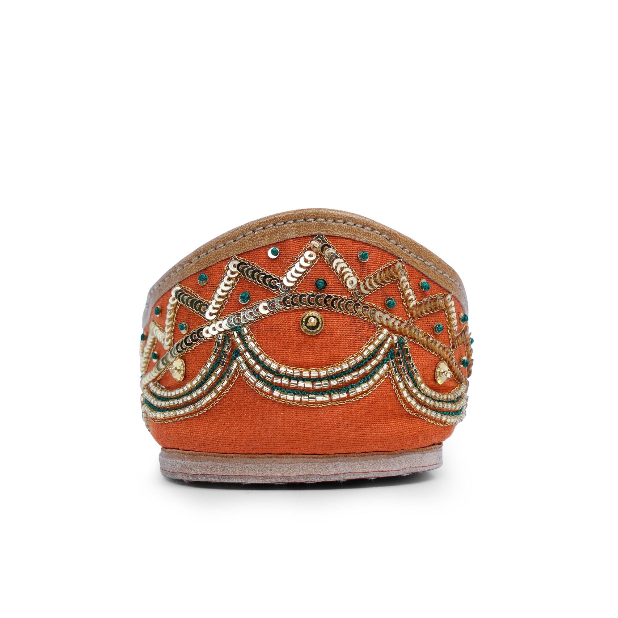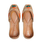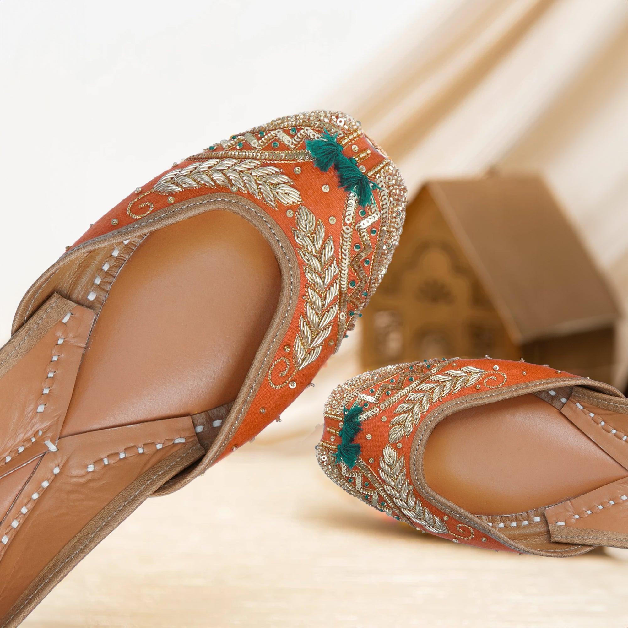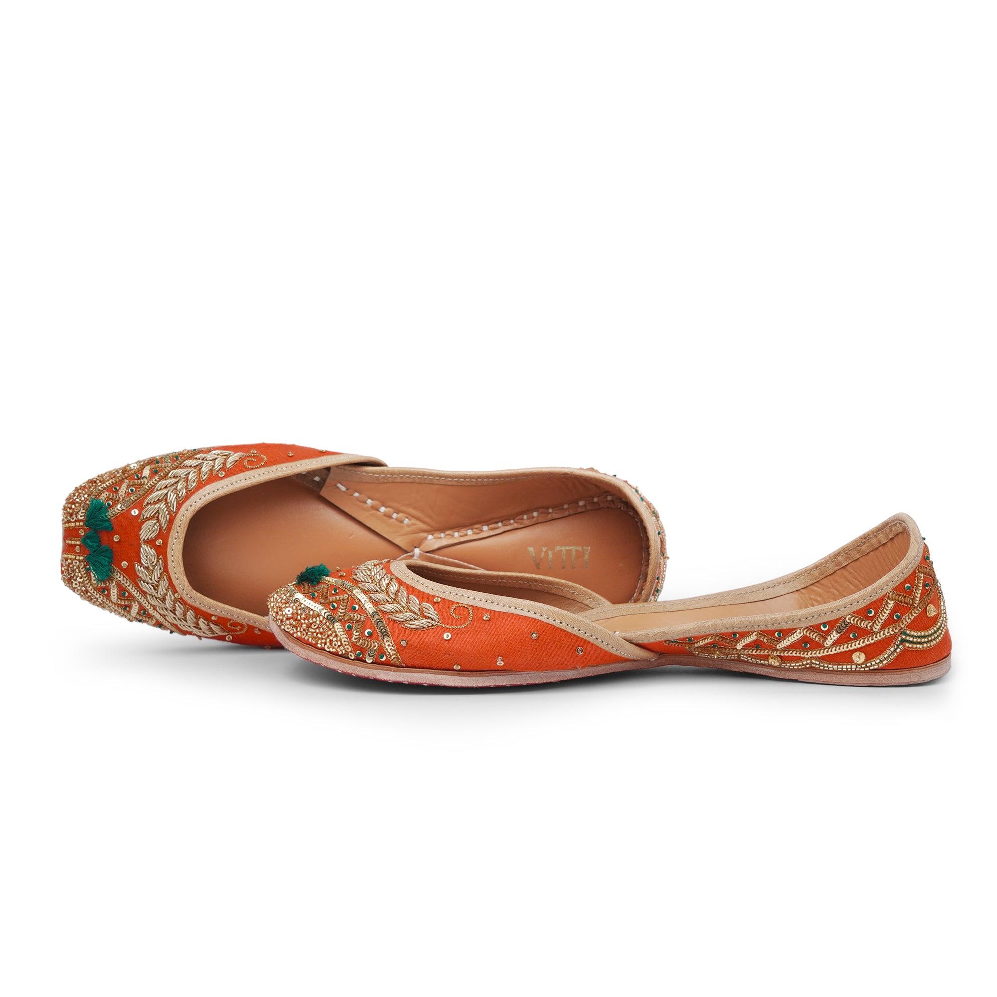 Crafted on a vibrant tangerine silk canvas, these juttis radiate the warmth and energy of festivities. The meticulous wheat grain embroidery, adorned with golden dabka, cutdana, sequins, and beads, showcases unparalleled attention to detail. Adding a playful touch of green silk thread completes the design, enhancing its festive charm. Step into the spirit of celebration with grace and flair, making this jutti your perfect dancing shoes for the festivities ahead.