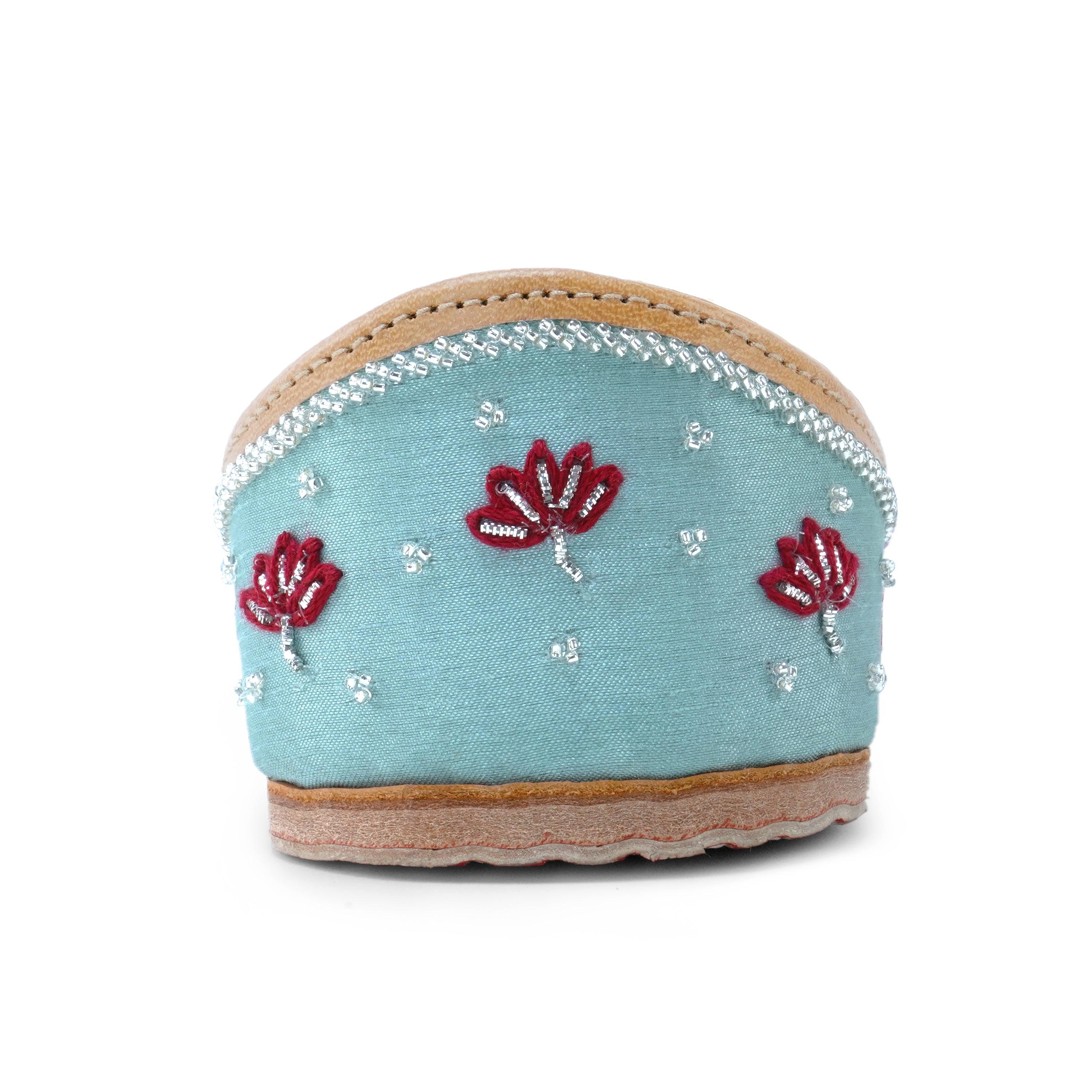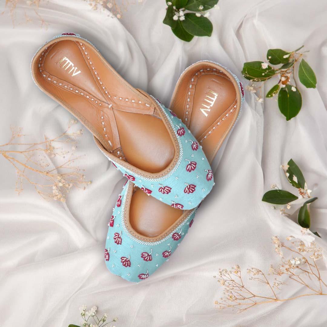 This versatile, elegant jutti offers the comfort your feet deserve. Adorned with silver beads and silver nakshi, finished with pretty maroon flowers, 'Noor' will make people fall in love with your style
