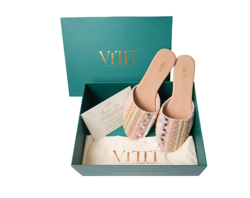 - Our Juttis are made using genuine leather and our Kolhapuris and Mules are made using vegan leather. The embroideries are done using traditional and modern patterns using techniques such as threadwork, beadwork, and sequin embellishments, aari and zardozi embroidery. This process requires precision and attention to detail, as each stitch contributes to the overall beauty of the design.