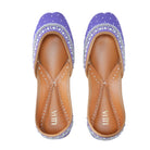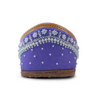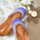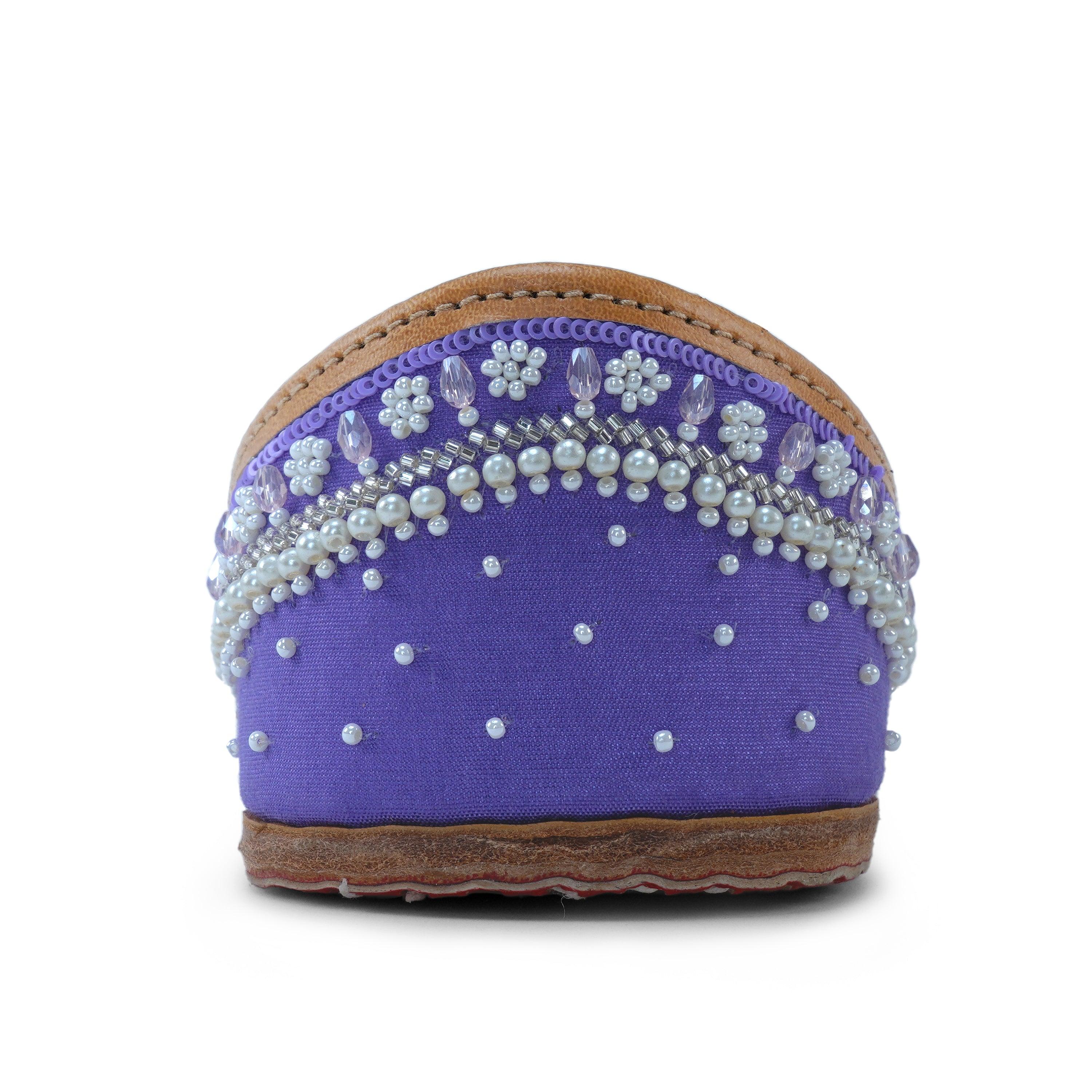 Introducing 'Azaa,' a stunning purple jutti embellished with radiant glass white pearls and small stone pearls on a shantoon base. Its lavender color base is adorned with off-white stone pearls, while the neck features intricate embroidery with purple sequins, transparent pink crystals, and silver cut dana. Style this jutti with your festive or everyday outfits to add a touch of elegance and shine.