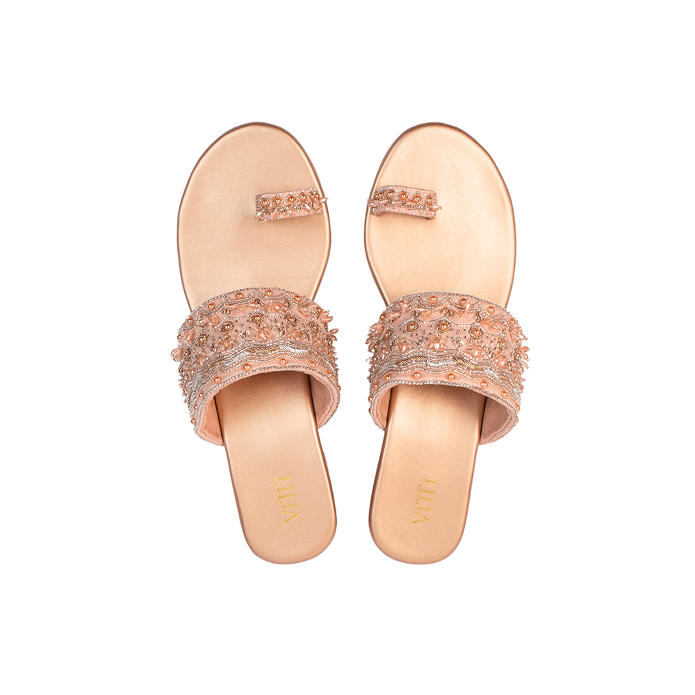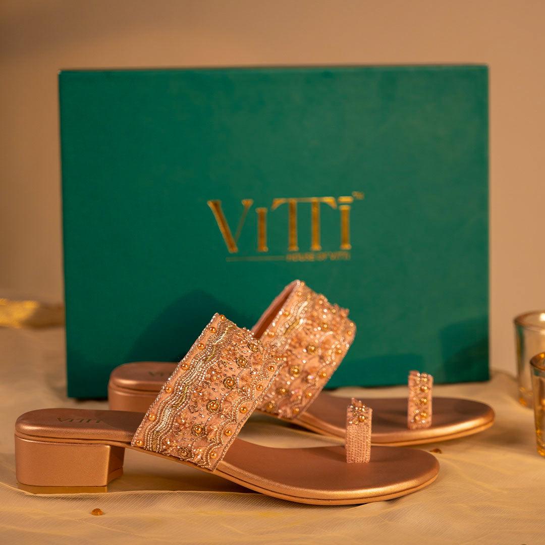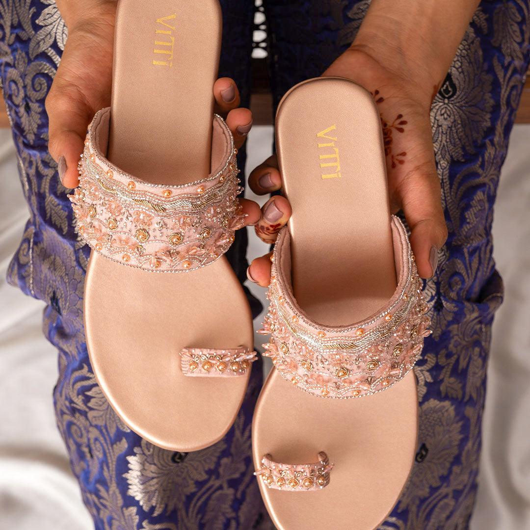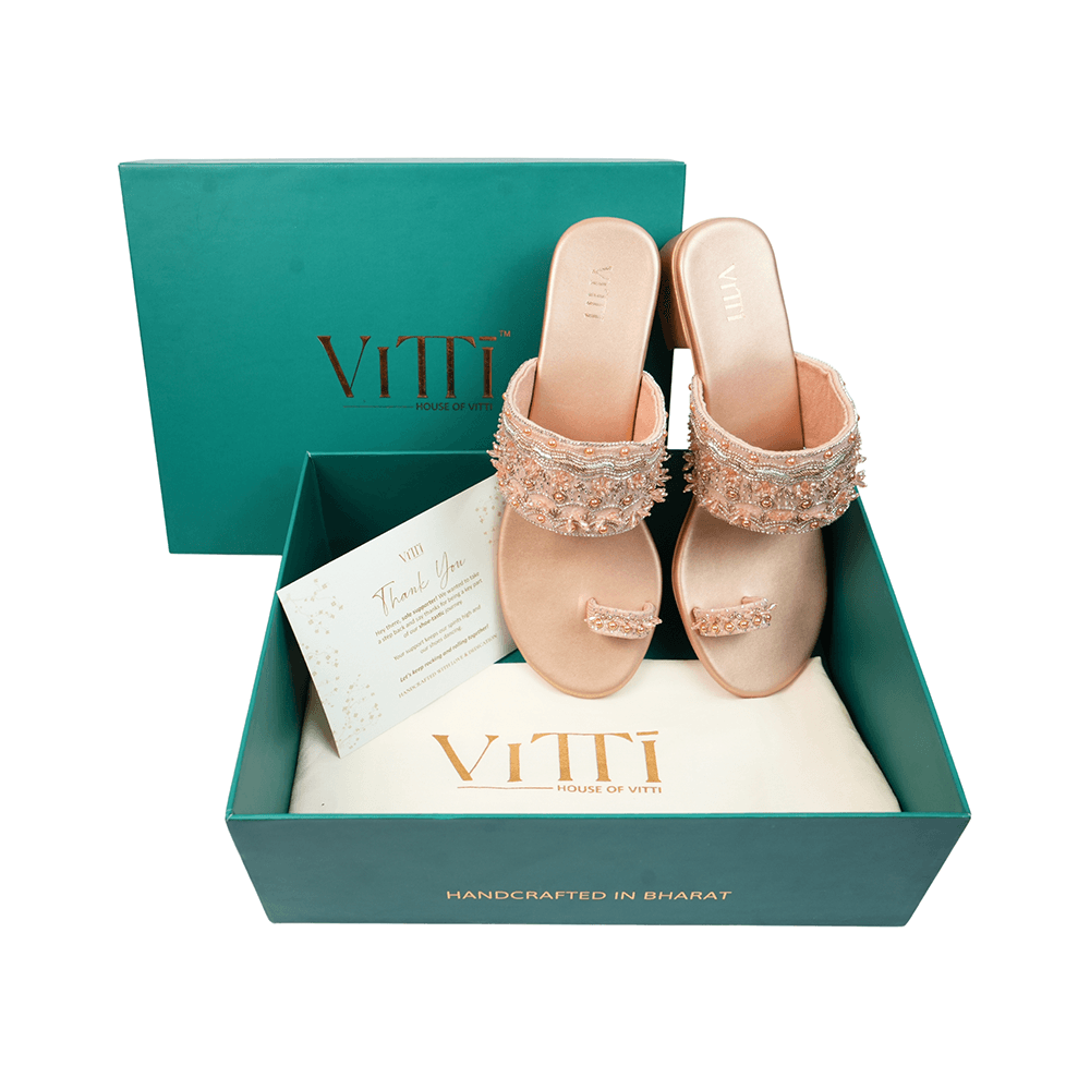 Add a sparkle to your festive season with our Blush Reverie Heels. The pink PU base is decorated with silver beads, gold dabka, and rose gold zari, with pink crystals hanging like tiny charms. The intricate embroidery makes these heels a standout piece, perfect for adding elegance to any outfit. Pair them with festive dresses or sarees for a radiant look.