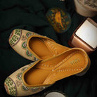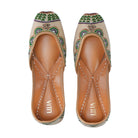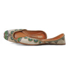 Authentic style never fades. True to its name, 'Evergreen' is an authentic Punjabi jutti with motifs inspired by nature. This light beige-colored jutti is adorned with lustrous, transparent, small shiny crystals, along with an outline of silver cutdana and silver zari work in small geometrical shapes. The look is completed by leaf motifs in green, brown, and purple anchor threads. Perfect for gifting to your closest and even to yourself, Evergreen's beauty is a must to dwell in.