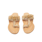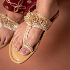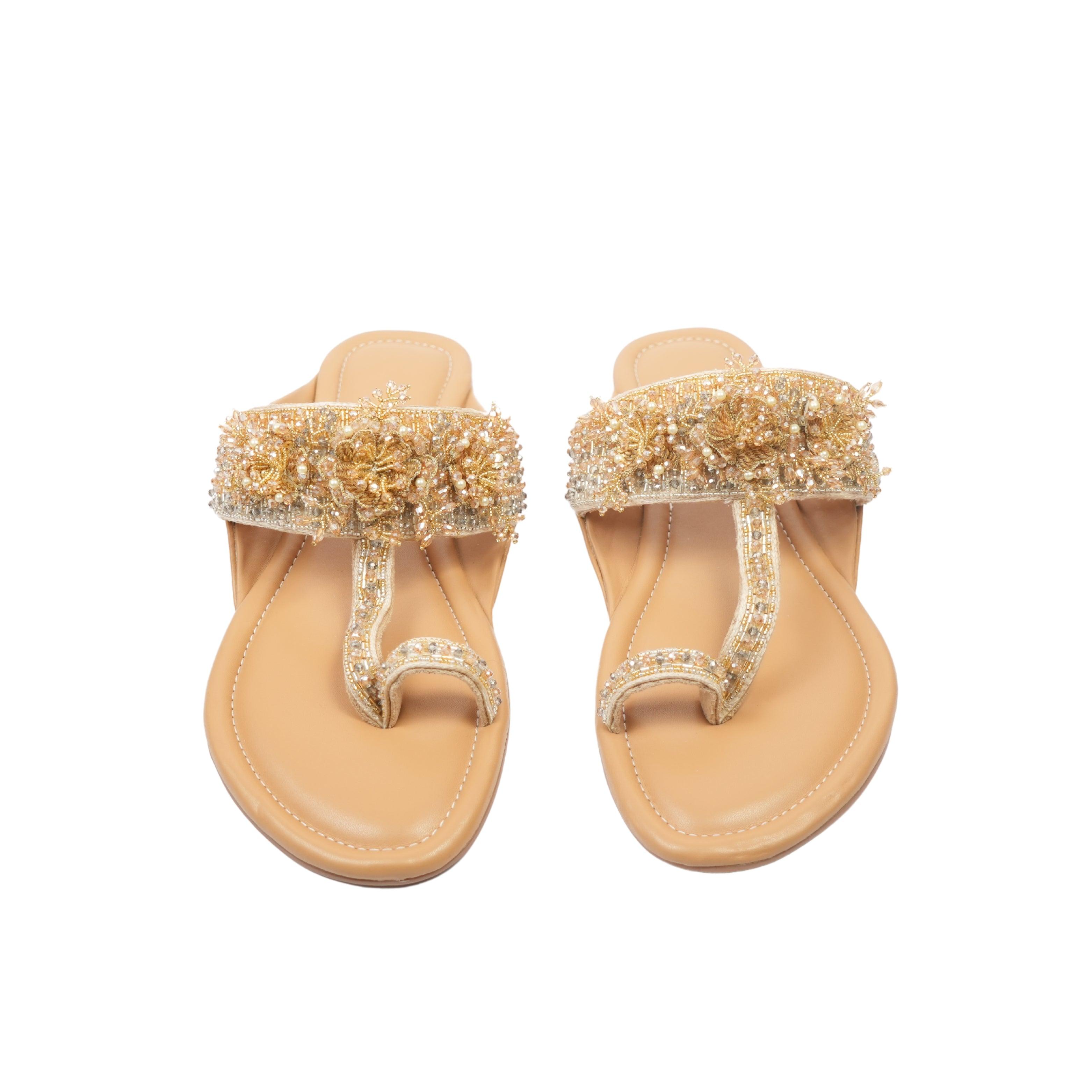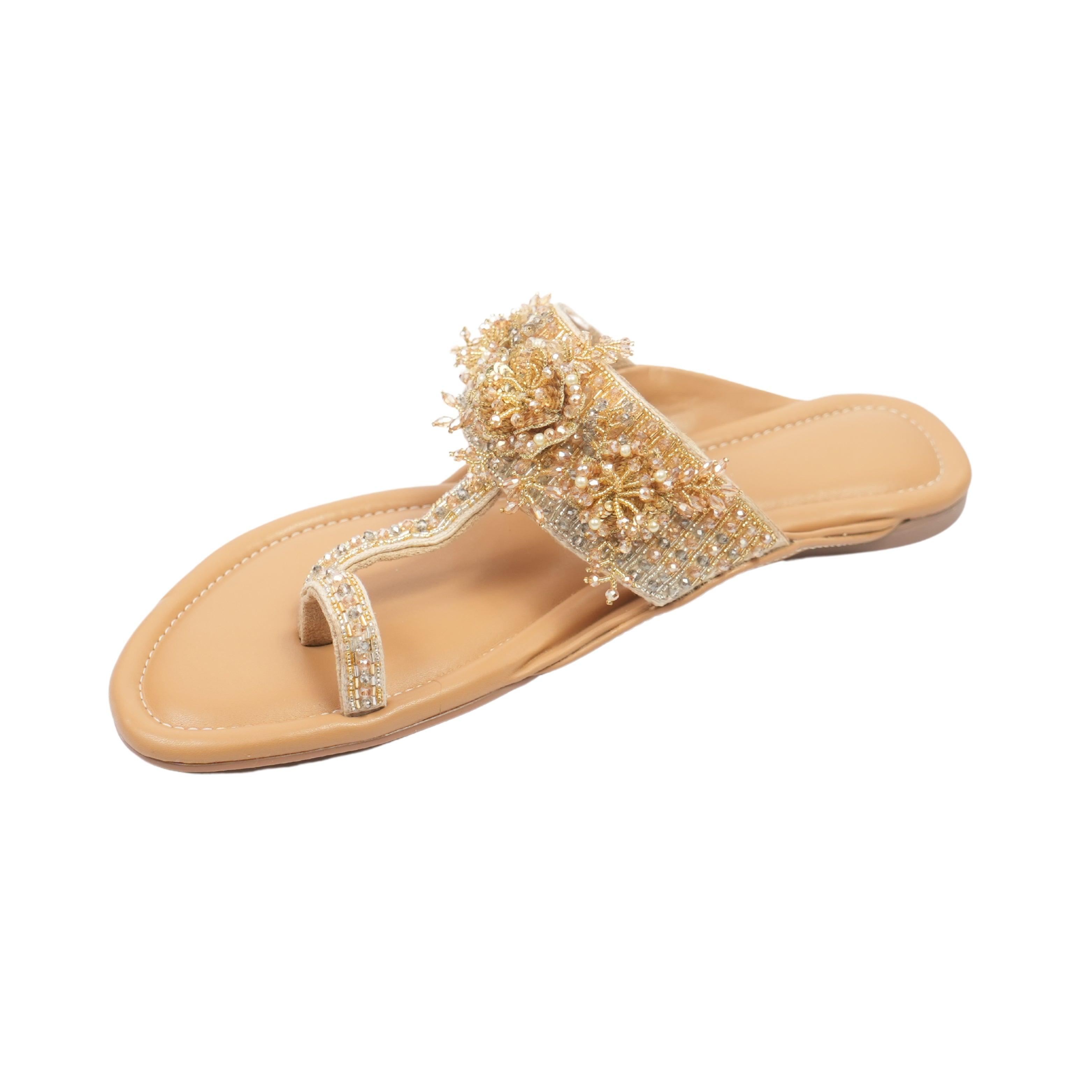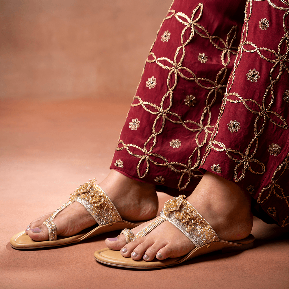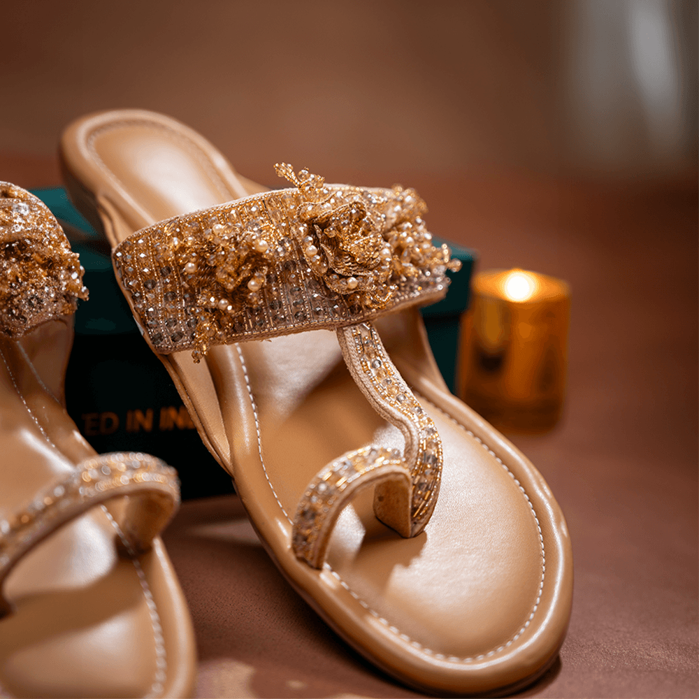 Make a statement with our luxurious gold Kolhapuri, featuring 3D floral embellishments and stunning zardozi work. Embroidered with gold and dull silver crystals, this versatile pair pairs effortlessly with any outfit, adding a touch of regal elegance to your look.