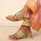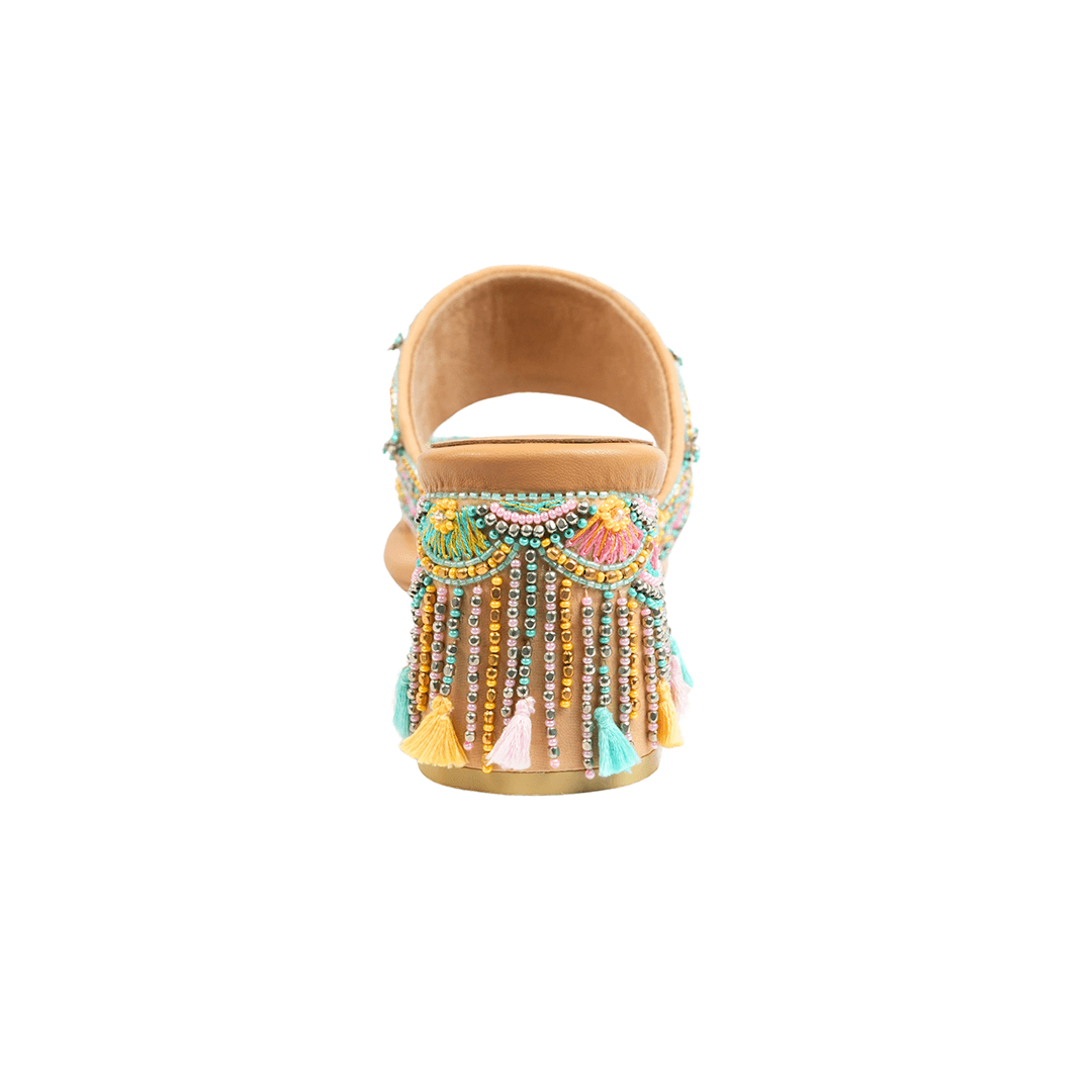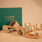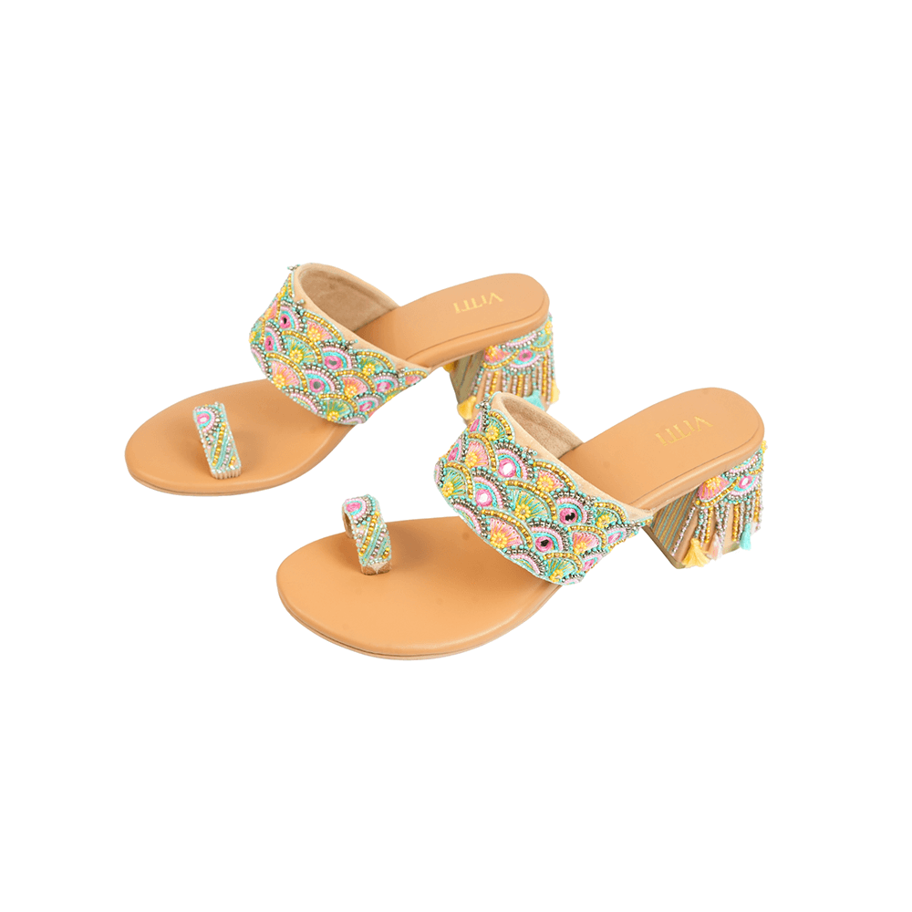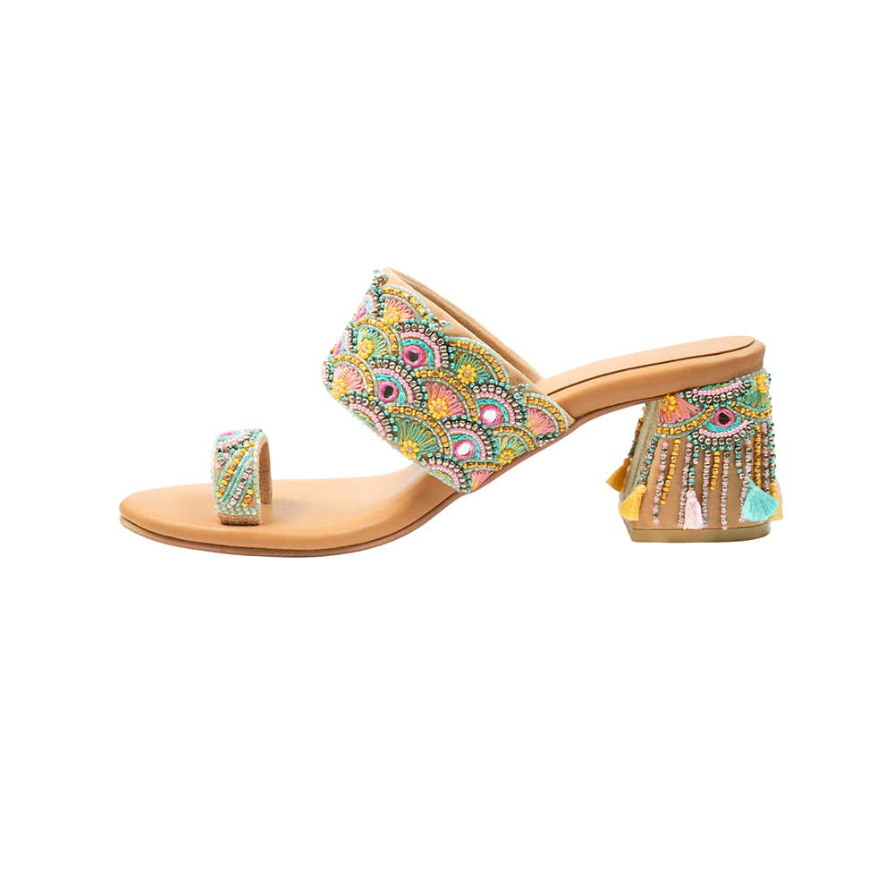Step into the festive season with our Kaleido Heels, a burst of vibrant silk threads in pink, yellow, and blue, creating an intricate zardozi embroidery. These heels are adorned with brass and silver beads, colorful embellishments, and delicate scalloped straps. Each step is a dance of pastel tassels and shimmering beads, making these heels the perfect festive statement piece. Style them with your favorite ethnic wear for a dazzling entrance.