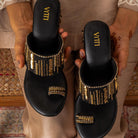 Add a touch of vintage charm to your festive wardrobe with our Mystic Black Heels. The black silk-satin base is adorned with silver and brass beads, cutdana, and tassel sequins, creating a complete vintage look. The danglers at the back add movement and elegance, making these heels perfect for festive celebrations. Pair them with traditional or contemporary outfits for a timeless look.