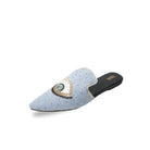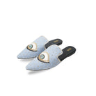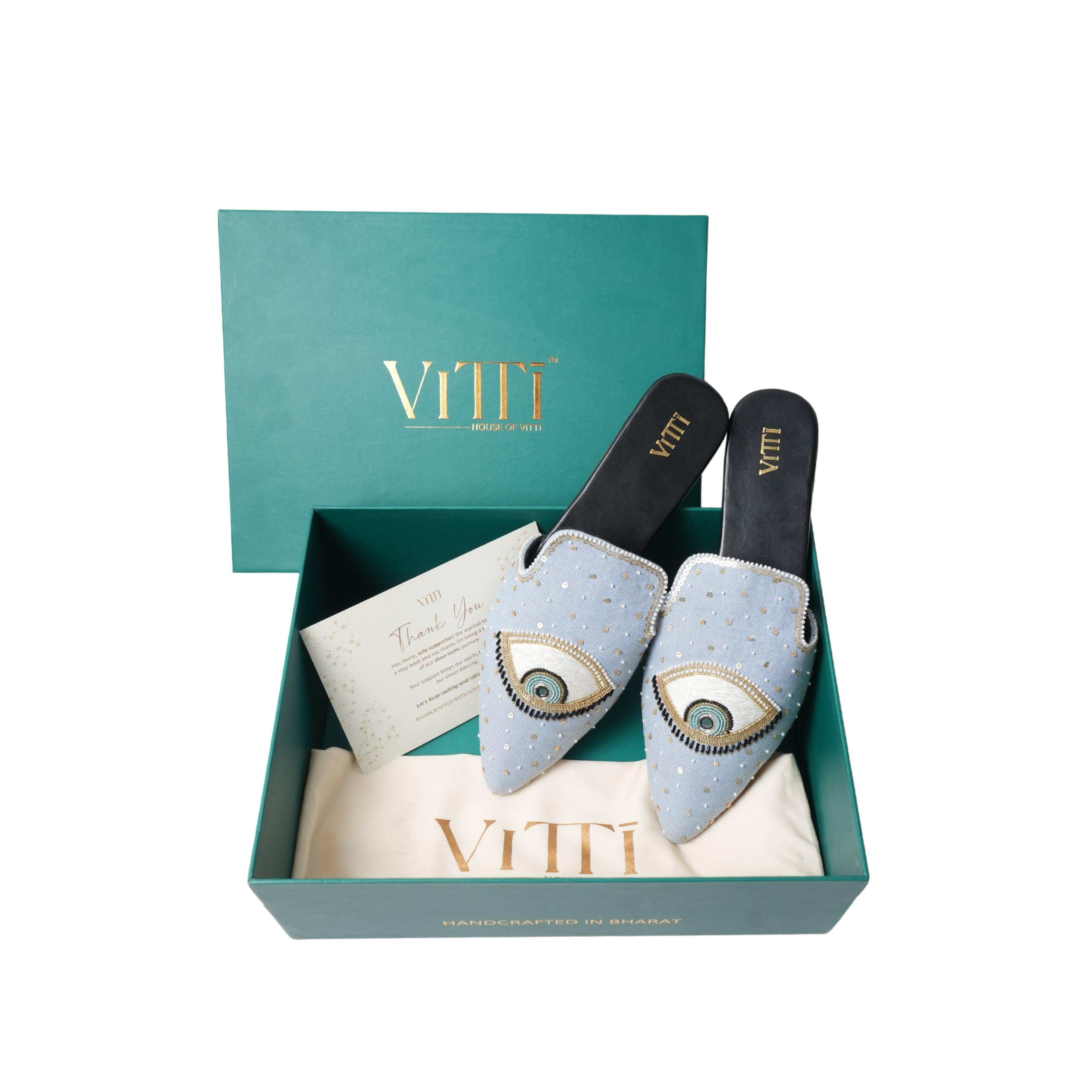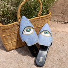 The light denim base sets the stage for the intricate evil eye design, featuring ivory anchor thread and black nalki for a striking eyelash effect. The eye is embellished with light gold sequins, outlined with gold beads, and accented with hints of gold sequins and polished pearls for added flair. The lower part of the eye is adorned with golden beads, polished pearls, and a mirror, outlined with black anchor thread, blue dabka, and silver dabka, creating a mesmerizing look. This mule is not just a shoe, but a statement piece that adds a touch of mystique to any outfit, making it perfect for the summer-spring vibe.