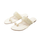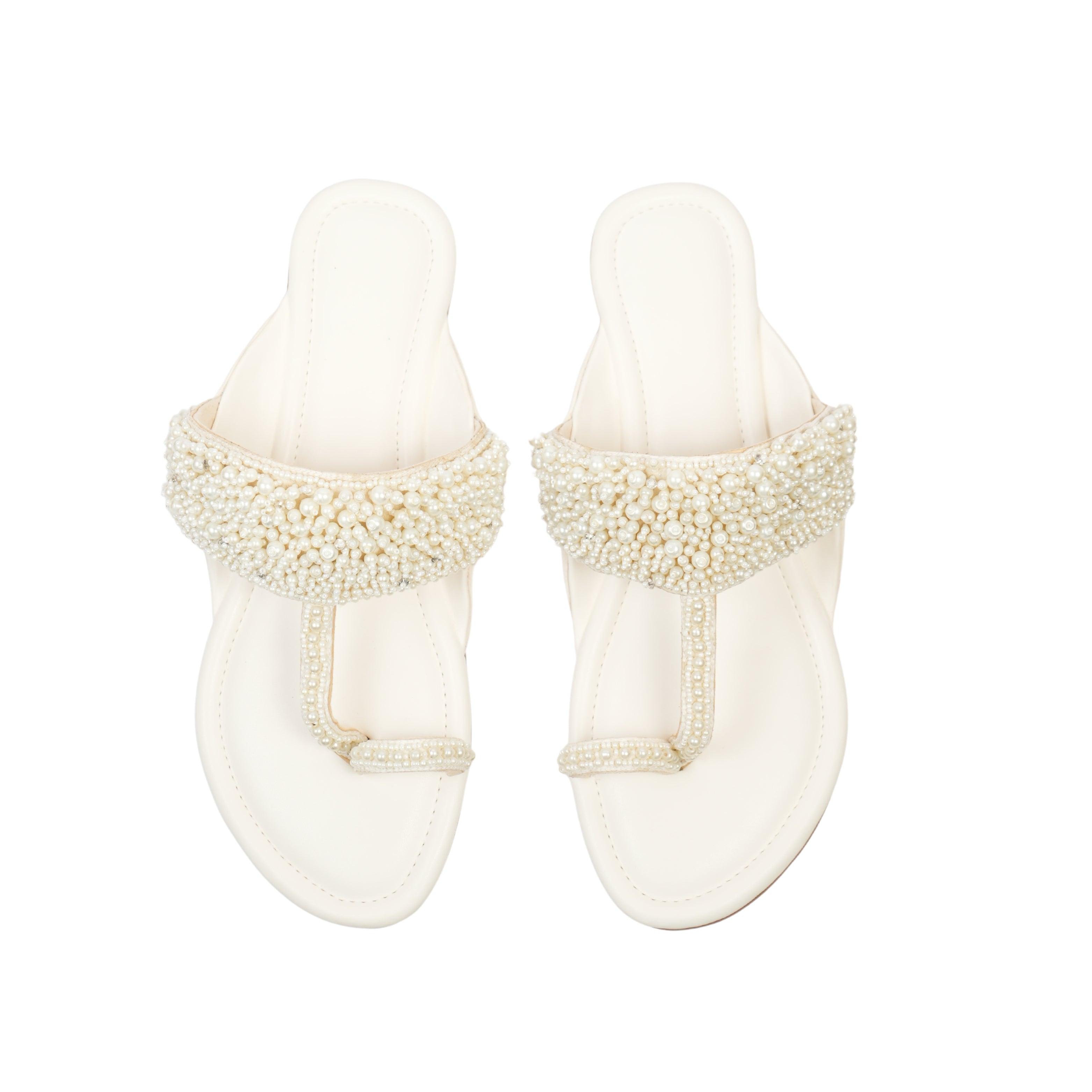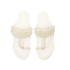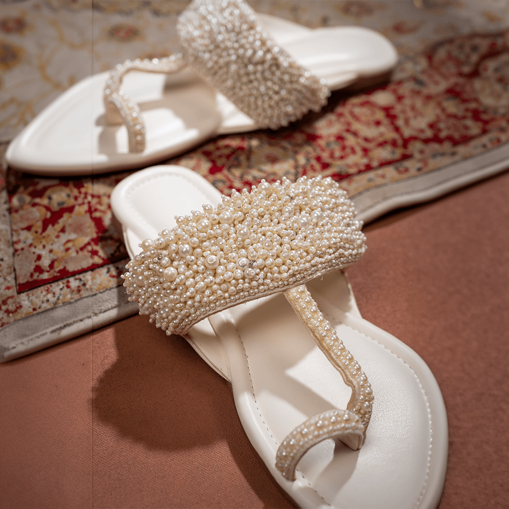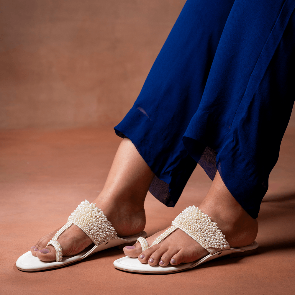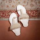 Introducing our stunning all-pearl Kolhapuri sandals - with a beautifully embroidered strap adorned with intricate pearls and silver crystals, this pair showcases the finest zardozi craftsmanship. Whether paired with traditional or modern outfits, these Kolhapuris add a touch of classic sophistication to any ensemble.
