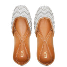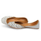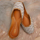 Silver Dreams Jutti, a radiant embodiment of luxury and elegance. This exquisite jutti is a true testament to the art of intricate craftsmanship. Adorned with an array of shimmering elements, including silver cutdana, transparent beads, sparkling crystals in various shapes, delicate silver zari, and silver nakshi embroidery, Silver Dreams exude opulence with every detail.